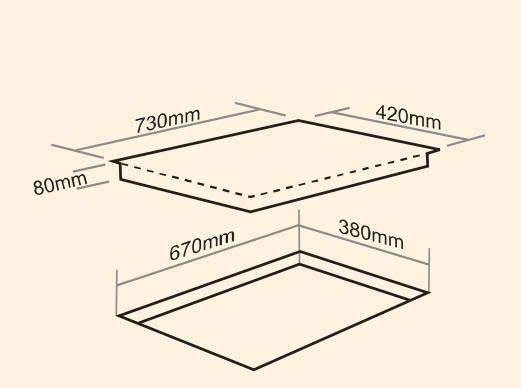 -Kích thước mặt kính: 730x420mm, kích thước khoét đá: 670x380mm