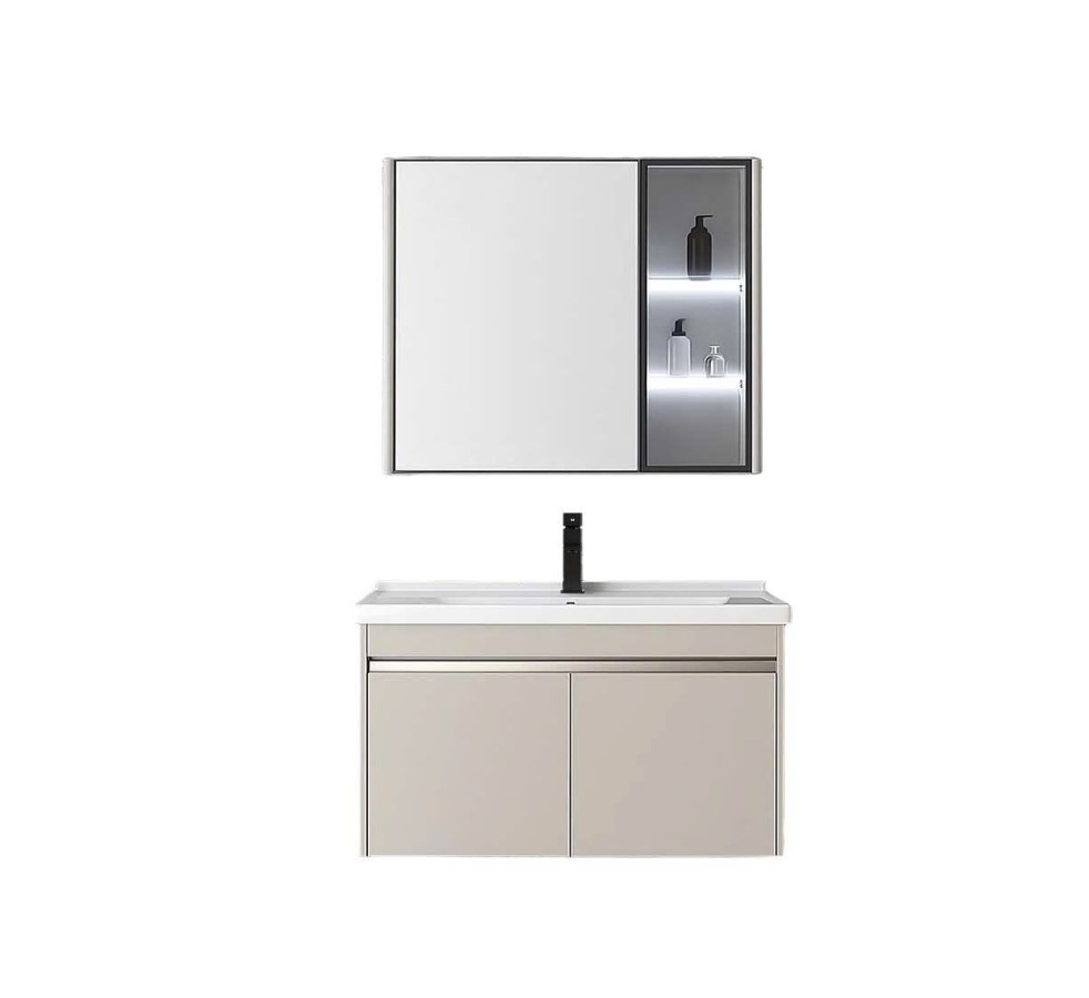 -Chất liệu: Gương phôi bỉ, đèn led chuyển động, chậu sứ, tủ nhựa PVC